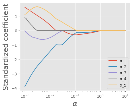 plot_elasticnet_reg_coeff(X_train_std.iloc[:,:5])