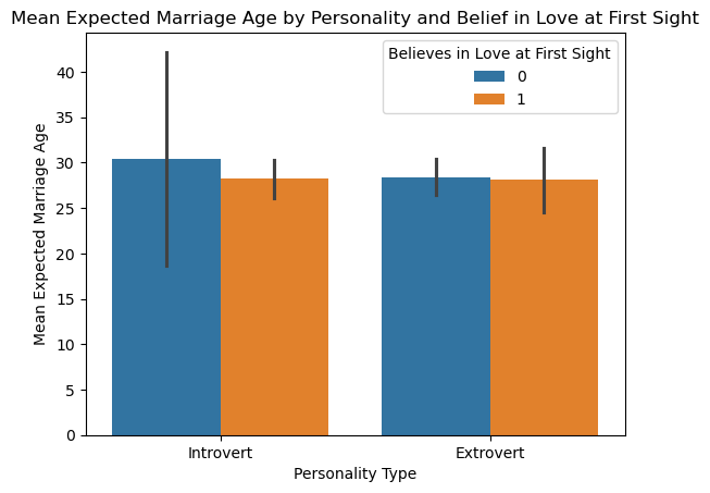 Does the mean expected_marriage_age of introverts and extroverts depend on whether they believe in love in first sight (variable name: love_first_sight)? Update the previous visualization to answer the question.