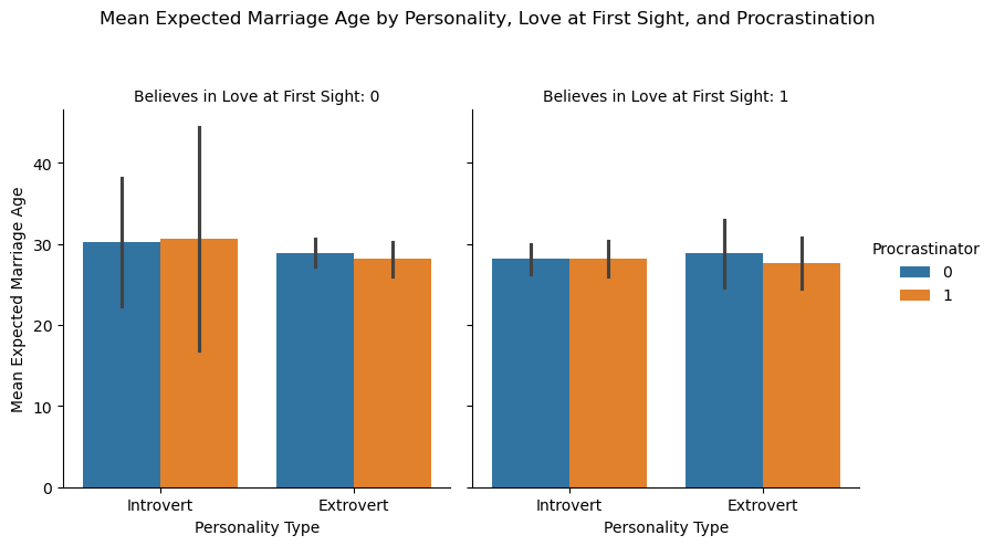 In addition to love_first_sight, does the mean expected_marriage_age of introverts and extroverts depend on whether they are a procrastinator (variable name: procrastinator)? Update the previous visualization to answer the question.