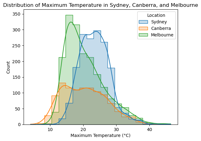Create a histogram showing the distributions of maximum temperature in Sydney, Canberra and Melbourne.