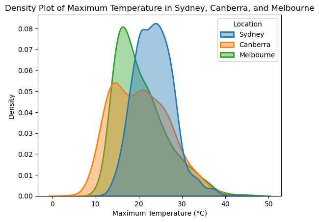 Make a density plot showing the distributions of maximum temperature in Sydney, Canberra and Melbourne.