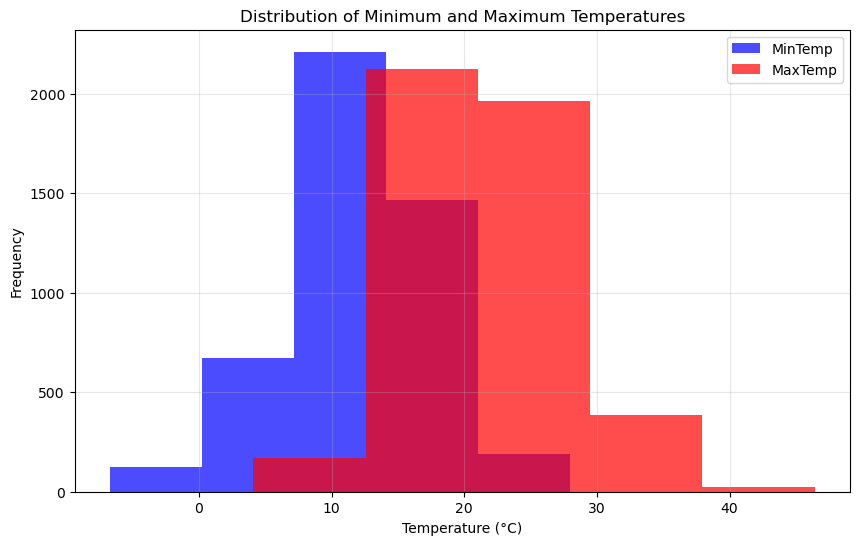 Show the distributions of the maximum and minimum temperatures across all locations in a single plot.