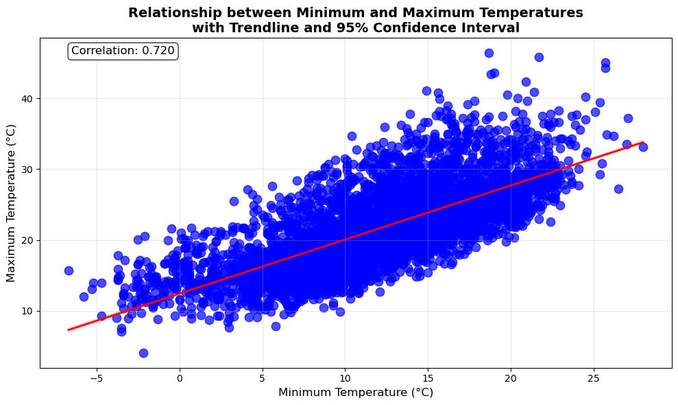 Create a scatter plot with a trendline for MinTemp and MaxTemp, including a confidence interval.